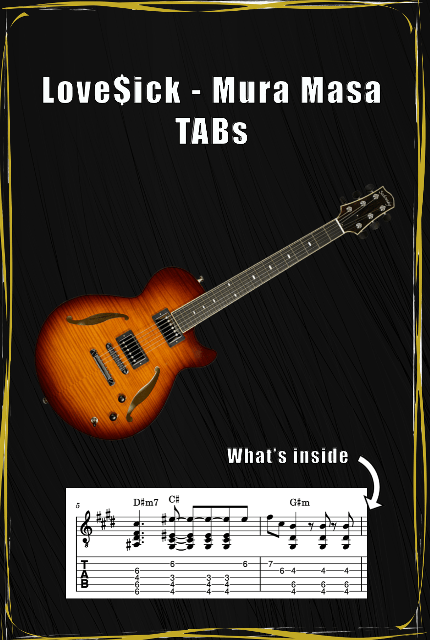 You will receive a PDF with TABs and standard notation for my arrangement of Love$ick by Mura Masa. You can find this version on any of my socials! Enjoy :)