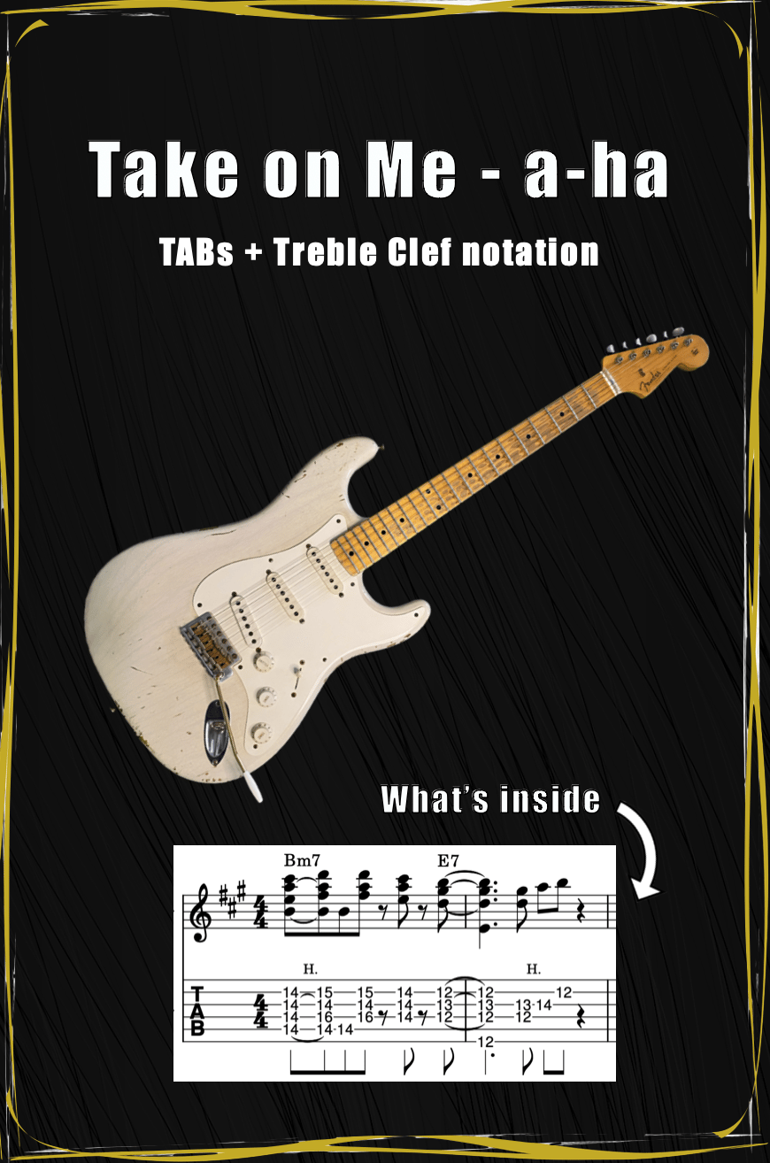 You will receive a PDF with TABs and standard notation for my arrangement of Take on Me by a-ha. You can find this version on my socials (scroll right to see clip)! Enjoy :)